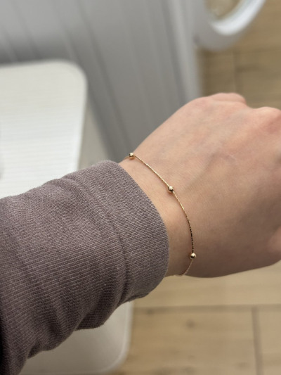 Браслет легко ложится по руке, подчеркивает женственность запястья. Шарики d-3мм, цепочка Снейк. Очень легкий, удобный. Купила к такому же колье.Смотрится превосходно!