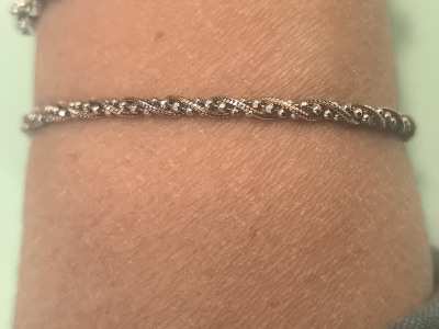 Браслет очень понравился. Сделано качественно и аккуратно. Оригинальное плетение, которое и даёт изумительный блеск изделия. Сочетание двух цветов- серебро и позолота. Позолота качественная ношу не снимая и даже в море. Рекомендую выбрать к покупке.