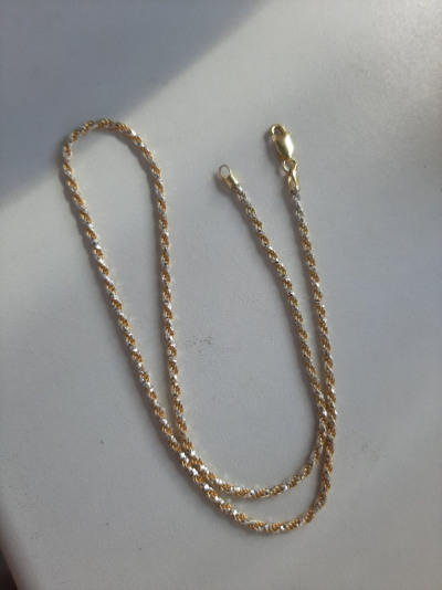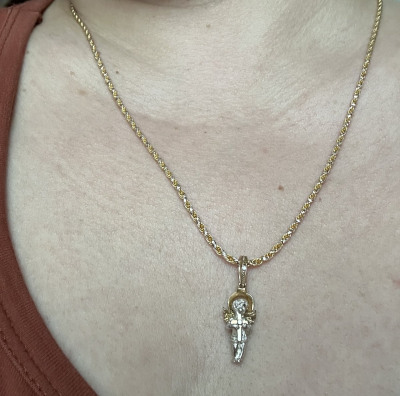 Искала к кулону, кулончик ангел серебро с желтой позолотой и цепочка такая же, смотрится просто потрясающе!