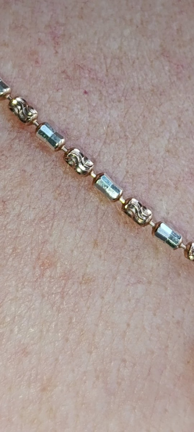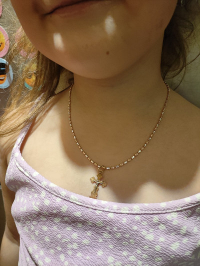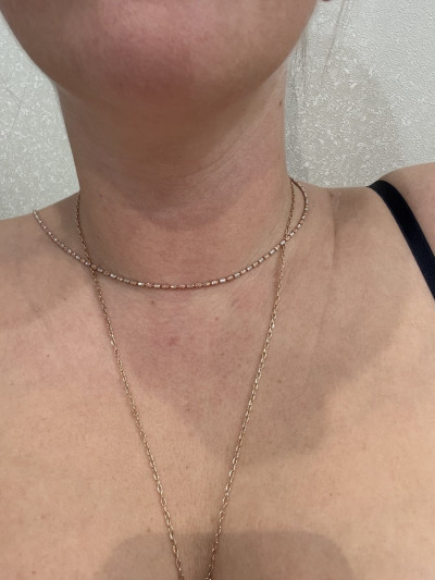 Ношу 4й день не снимая, принципиально хочу посмотреть, как себя поведёт в повседневной нОске. Пока восторг! Блеск и сверкание при освещении невероятные!!! На шее не ощущается совсем, лёгкая, не цепляется, комфортная! На фото видно, что серебристые звенья имеют грани, благодаря чему они отражают окружающую среду и меняют цвет! А позолоченные звенья имеют волнистые типа вензели, что тоже очень стильно выглядит! Вообще сочетание серебра и золота в этом изделии выглядит потрясающе! Поэтому можно носить с любой подвеской, хоть серебряной, хоть золотой, либо вообще без - цепочка выглядит как чокер или как бусы типа из бисера. И ещё - на расстоянии выглядит как золото, несмотря на комбинацию материалов. Общий вид как золото! Продавец сказала, что чистить надо просто тряпочкой для протирки украшений, без всяких доп. средств. Посмотрим. Пока я очень довольна покупкой!