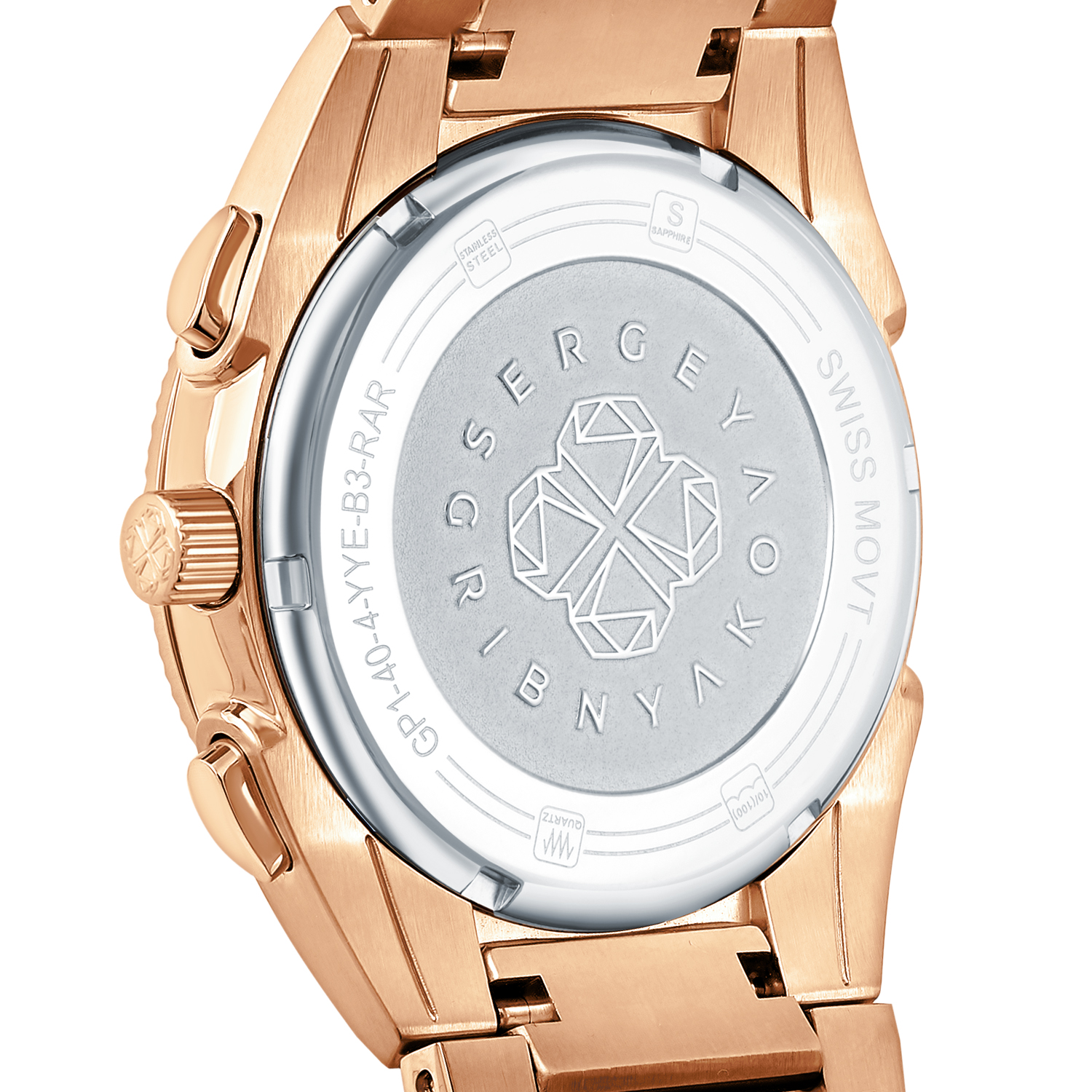 Корпус выполнен из стали 316L, сапфировое стекло с антибликом защищает циферблат от внешнего воздействия. Надежный швейцарский кварцевый механизм Ronda 5030D оснащен функциями времени в 12 часовом формате, секундной стрелкой, датой и хронографом. Водозащита 10 bar (100 m/330 ft)* позволяет плавать в часах.