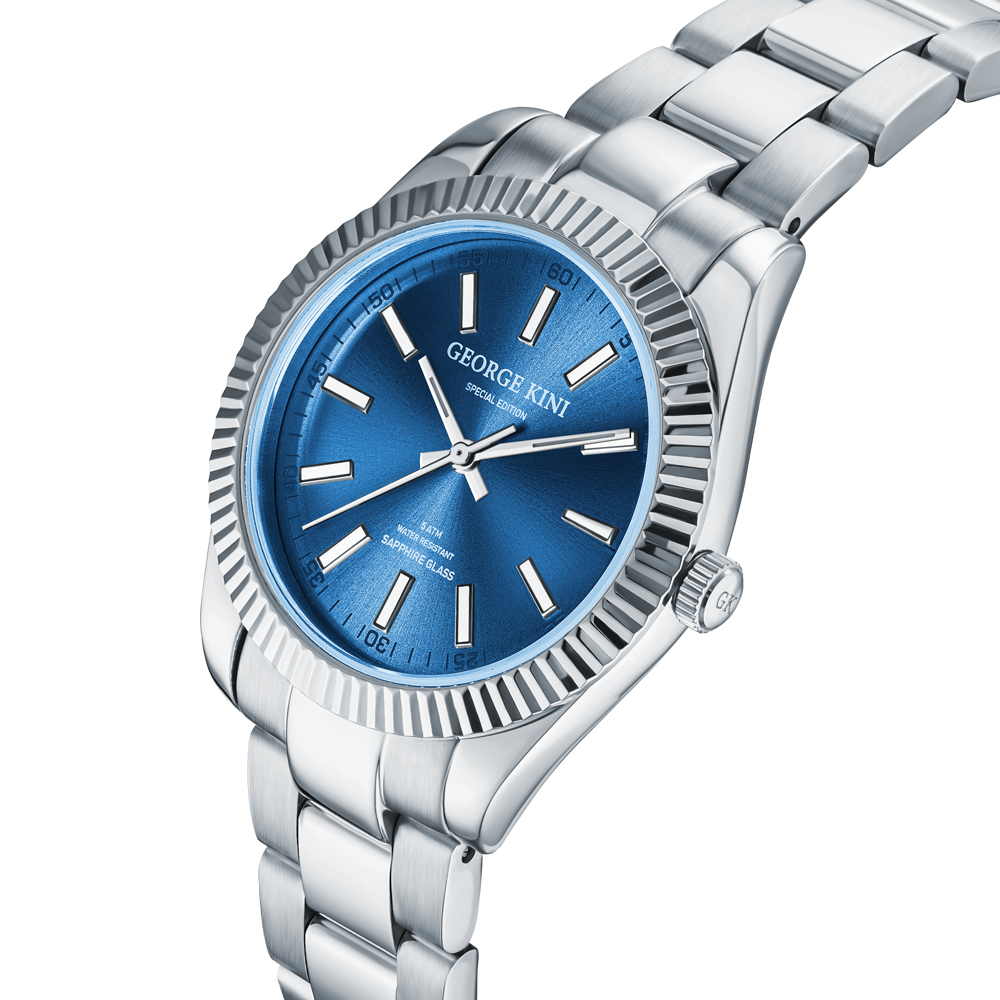 Часы George Kini коллекции SPECIAL EDITION воплощают эксклюзивность и элегантность, предлагая идеальное сочетание современного дизайна и передовых технологий. Корпус из нержавеющей стали 316L диаметром 36 мм с сапфировым стеклом с антибликовым покрытием надежно защищает циферблат, сохраняя его безупречный вид. Циферблат с эффектом Sunray отражает свет, придавая часам особое очарование. Внутри — Японский кварцевый механизм (с датой), гарантирующий точность и долгосрочную надежность хода. Водозащита 5 bar (50 m/165 ft), обеспечивающей защиту от дождя и брызг.