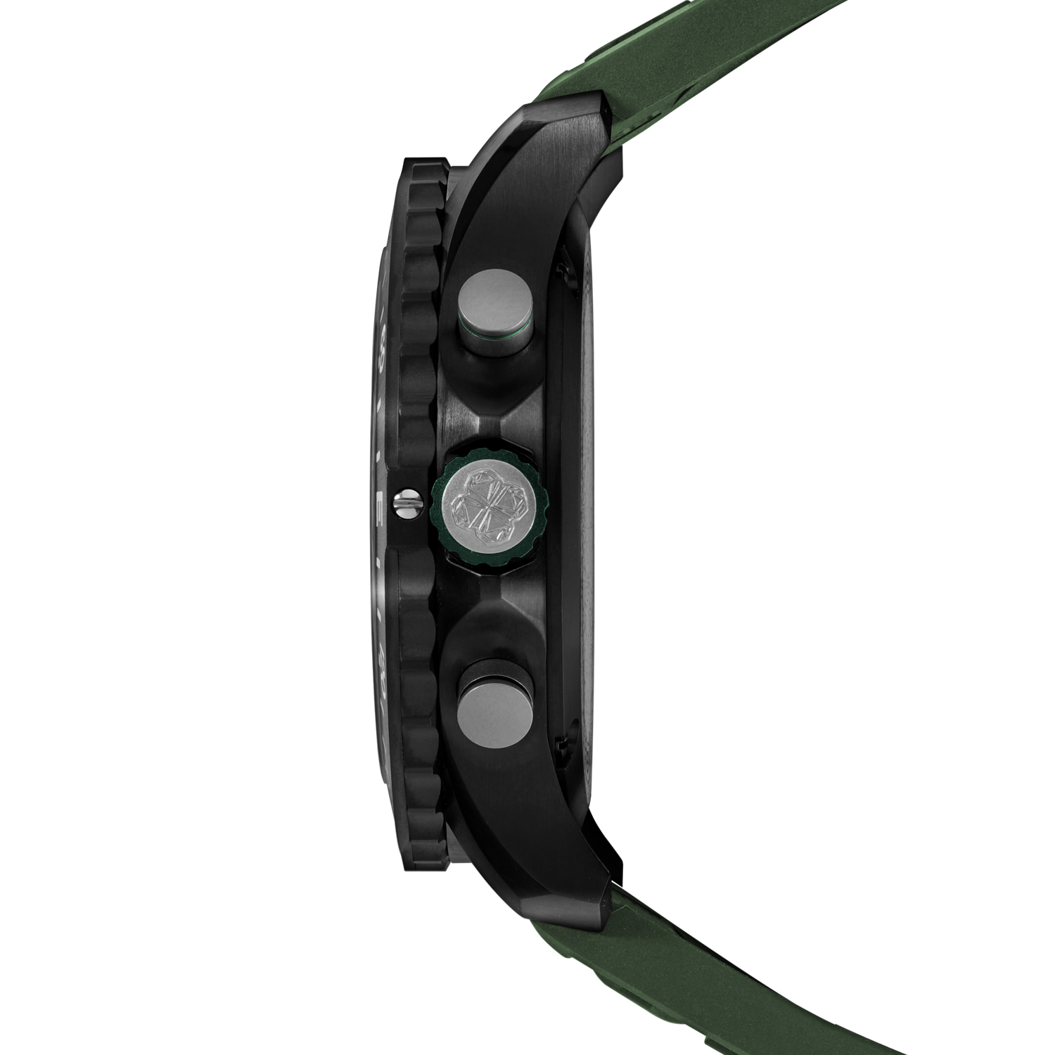 Корпус выполнен из титана. Он легче и прочнее стали. Сапфировое стекло с антибликом защищает циферблат от внешнего воздействия. Надежный швейцарский кварцевый механизм Ronda 5030D оснащен функциями времени в 12 часовом формате, секундной стрелкой, датой и хронографом. Водозащита 10 bar (100 m/330 ft)* позволяет плавать в часах.