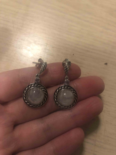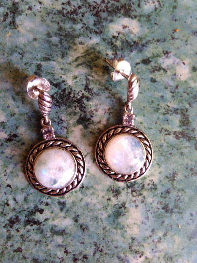 Лунный камень с маленьким аметистом в серебре в виде сережек. Заказала еще кольцо к комплекту. Красивые, не смотрятся массивно, очень женственные.