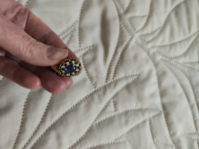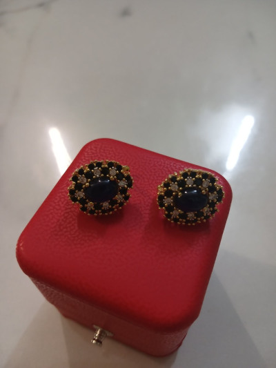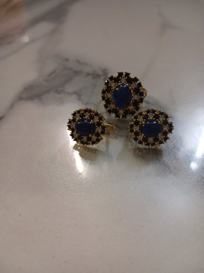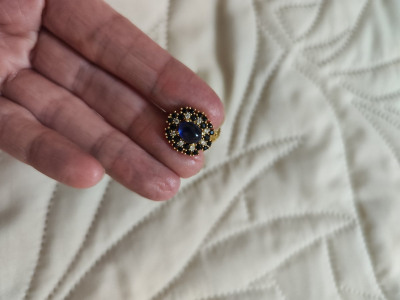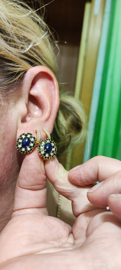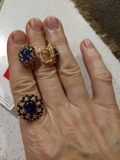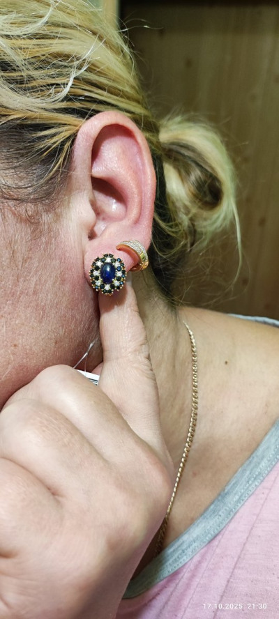 Очаровательные серьги с натуральными сапфиром и шпинелью, серебро в позолоте. Не большая застёжка на среднюю мочку уха, не отвесают, хотя вес приличный 7,47гр.. В комплекте с кольцом выглядят великолепно. Просто царский комплект. Брависимо!!!