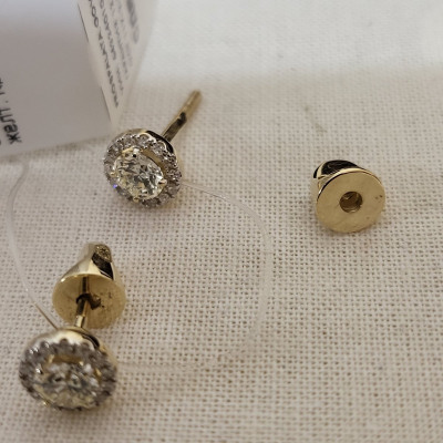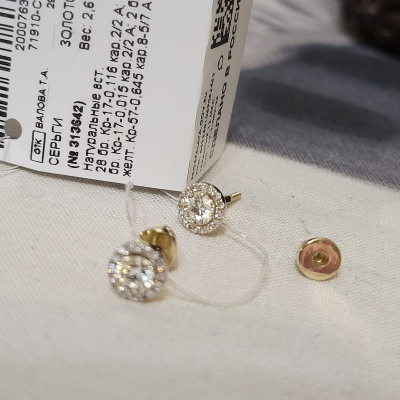 Серьги с 28 бриллиантами природными, 0.11 карат, огранка круг 17 граней, цвет 2, чистота 2, тип огранки А;