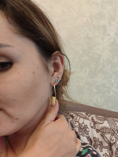Хорошие серьги, купила сначала золотые, потом ещё и серебряные с серебряной цепочкой. Блестят не сильно, не тяжёлые. Спать в них удобно. Эти серьги больше подойдут брюнеткам. На белокожих блондинках теряются. Но, я всё равно выкупила.