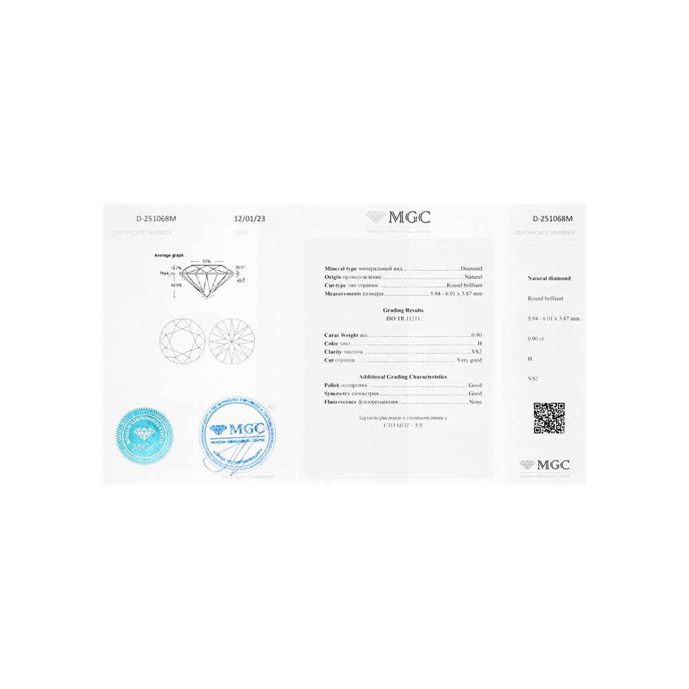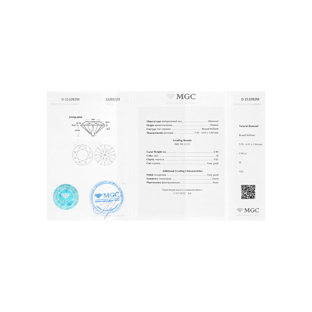 1 бриллиантом природным, 0.9 карат, огранка круг 57 граней, цвет 5, чистота 5, тип огранки А;
