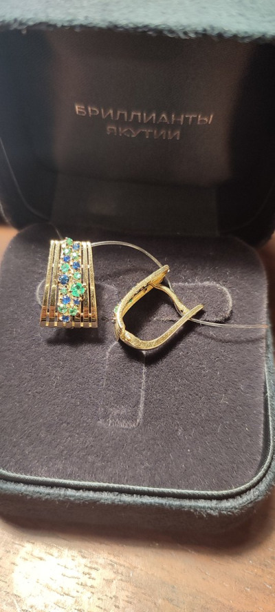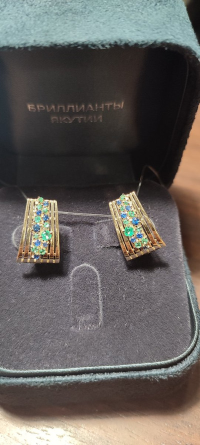 Стильные серьги - строгие линии, при этом фантазийная дорожка из камней. В моих изумруды светлые и почти прозрачные, а сапфиры наоборот глубокого тёмного цвета. Мне очень понравились! В жизни выглядят лучше, чем на фото. Удобная посадка, даже на тонкую мочку. Размер всей серёжки 1,5 см, и прокол закрыт. Жду к ним кольцо своего размера :)