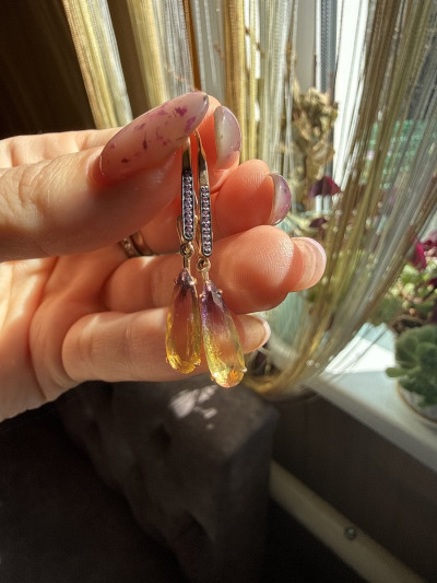 Давно нравились аметрины. И к 8 марта предложили отличные скидки, поэтому выбор подарка оказался очевидным). Так получилось, что у меня довольно высоко расположены проколы, поэтому подавляющее большинство сережек мне не подходят. В конкретно этих серьгах очень понравилась застежка. Ничего не давит. ничего не слетает. А камешки просто бесподобны!