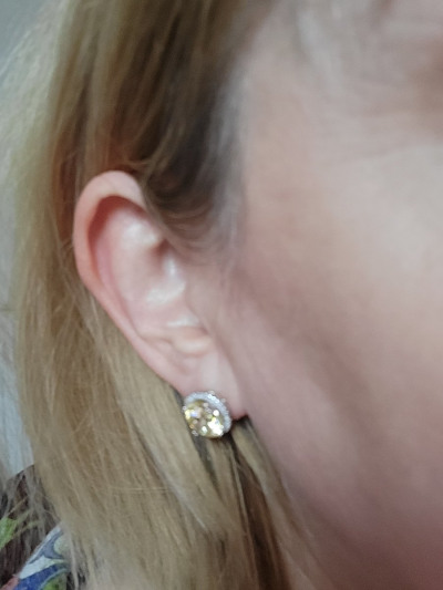 Крупные сверкающие камни красивого бледно-желтого цвета , обрамление из мелких бесцветных фианитов добавляет блеска , лицо словно освещено . Чтобы камень не свисал вниз , как пишут в предыдущих отзывах , надо штырек расположить вверху , так как он припаян не в центре , а выше . И тогда серьги сядут , т.к. центр тяжести сместится наверх . Я боялась из-за этого покупать , но в итоге , довольна , хотя у меня низкий прокол и серьги расположены чуть ниже мочки . Заказала ещё кольцо .