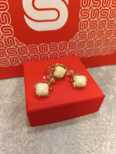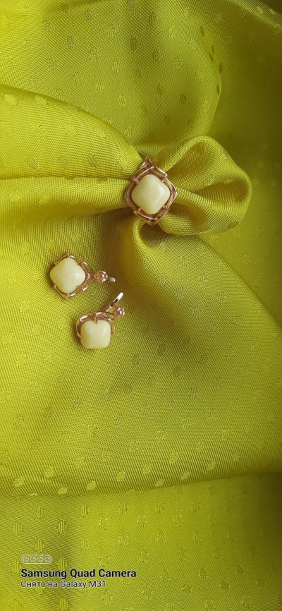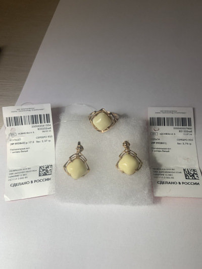 Комплект очень интересный))))белый янтарь,смотрится очень хорошо.камень крупный и чистый