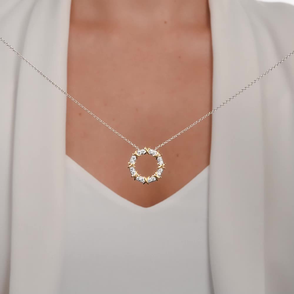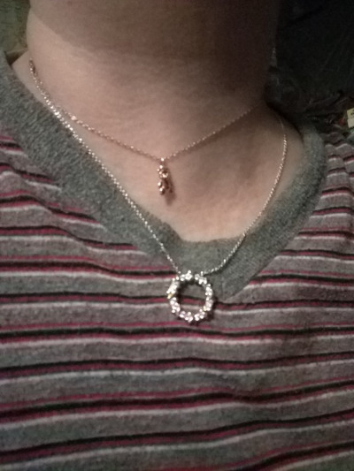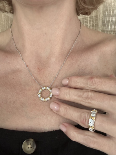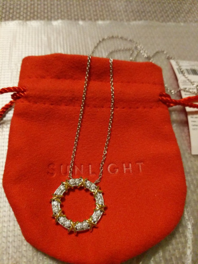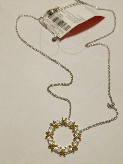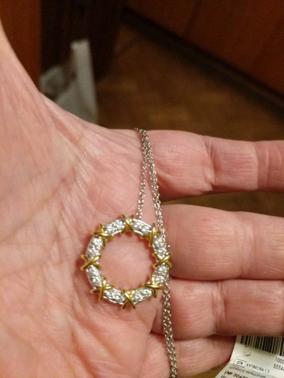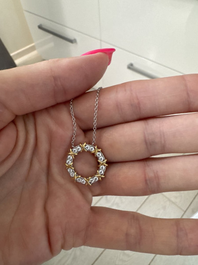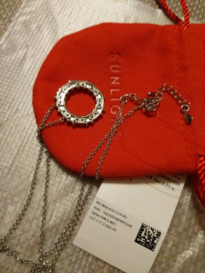 Модное, стильное и о-о-о-ч-чень красивое шейное украшение в виде окружности из родированного серебра 925° с золочёными декоративными элементами. Подвес несъе́мный, цепочка якорного плетения, но интересного, как бы двойного, с удлинением; застёжка - "карабин". Размер цепочки - 40-45 см. Бесцветные фианиты с отличной огранкой на подвесе при солнечном или вечернем освещении могут потягаться с бриллиантами. Шикарное, нарядное украшение, но цена, конечно...🤔😵💫 🙆🏻♀️