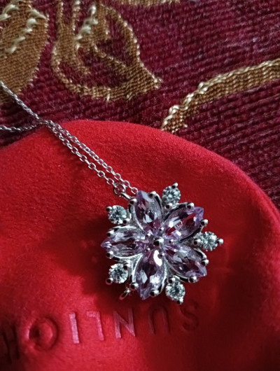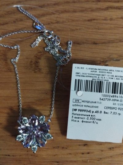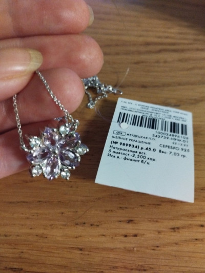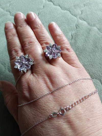 Это шейное украшение просто прекрасное!Аметист сложили в виде цветка, и в сочетании с серебром хорошо смотрится вместе.
