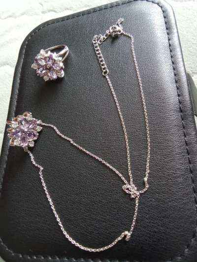 В шейном украшении очень нежный цвет аметистов - розовато-сиреневый. Цепочка не съёмная, но можно регулировать размер. Шикарное украшение для торжественных случаев! Я очень довольна покупкой! 😊