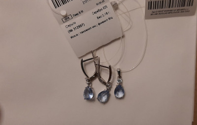Очень понравился комплект с такими же серьгами. Нежно выглядит, цвет сиреневато-голубой, но зависит от внешней освещенности, играет.