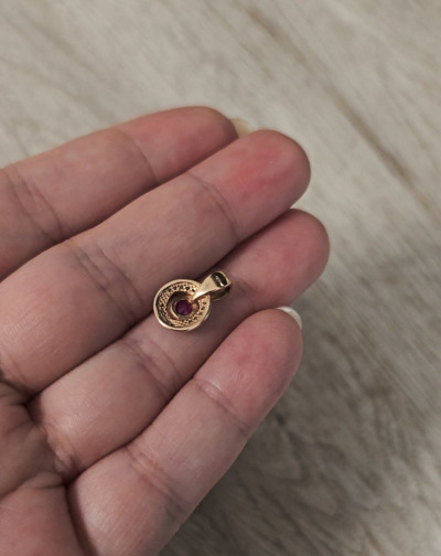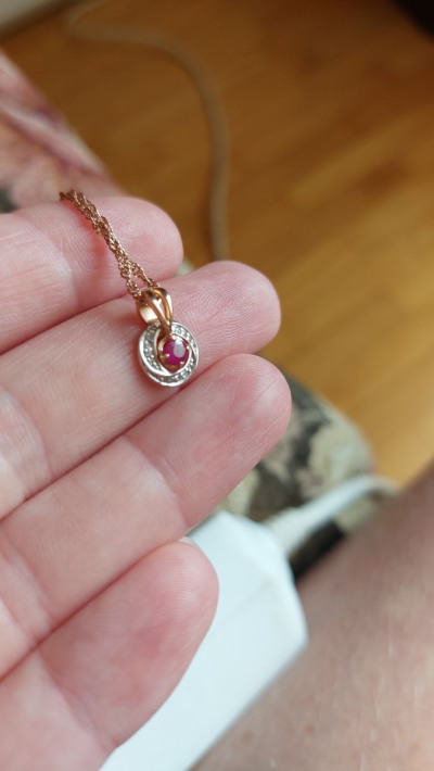 Подвеска красивая, не смотря на небольшой размер. На тоненькой цепочке смотрится отлично. Рубин натуральный, не мелкий. Ушко подходит под любую цепочку. Под мои пуссеты подошла идеально.