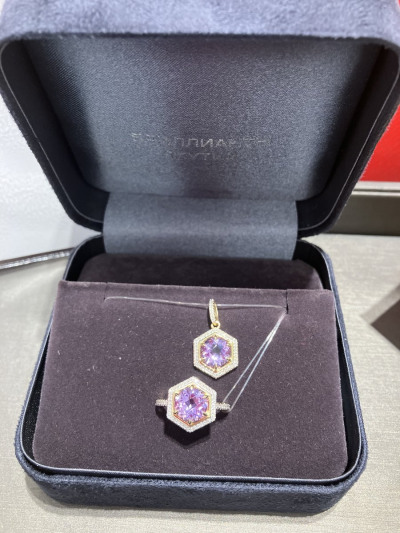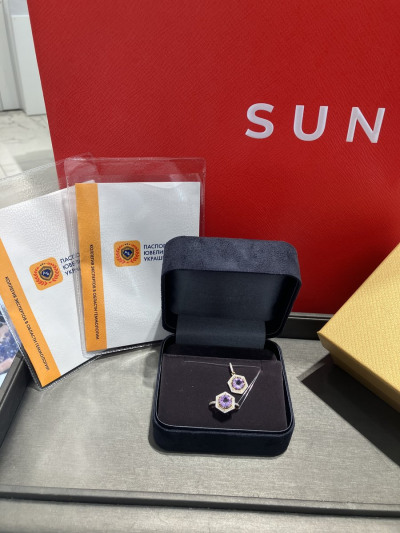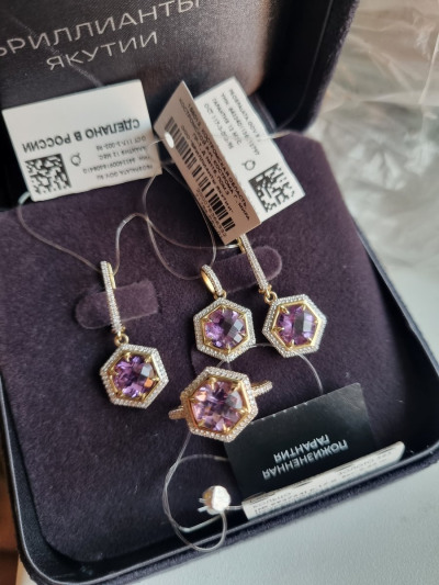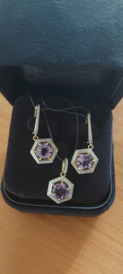 Обменяла золотую мелочь, которую никто не носит уже давно, на такой замечательный комплект с аметистами. Кольцо, кулон и серьги. Моё любимое лимонное золото. Очень нарядно и изысканно смотрится комплект. Аметисты крупные, бриллиантовая окантовка так и сияет