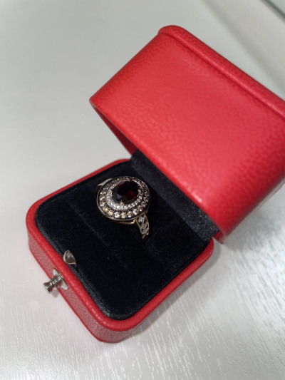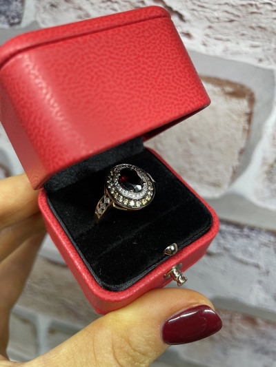 В редких случаях характеристики украшения или упаковка могут иметь отличия от представленных на фото или в описании.Кольцо с 1 гранатом, 1.456 карат, тип огранки Б; фианит шампань; фианит;