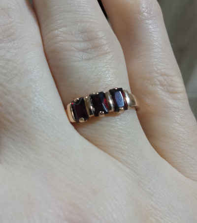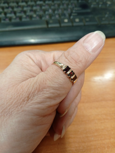 Строгое, аккуратное колечко. Гранат тёмный насыщенный, хорошо закреплён. Носить удобно, не цепляет, не царапает