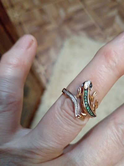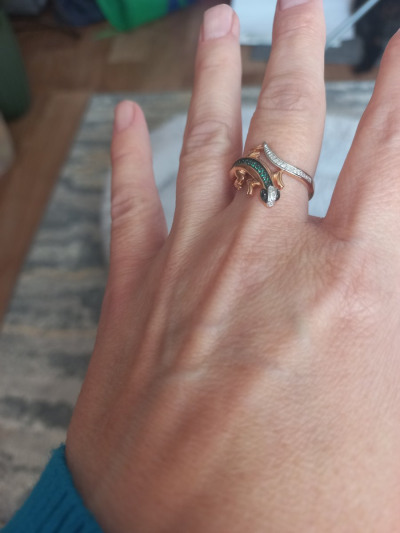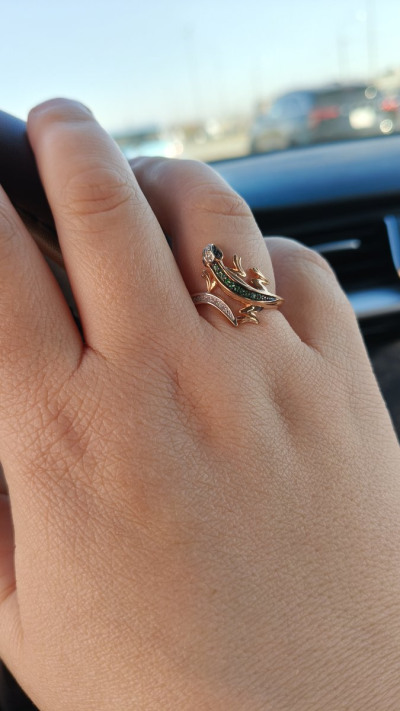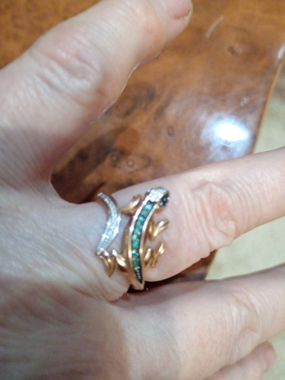 Очень люблю всяких ящериц,змей,лягух,пауков в украшениях))) Она бесподобна))) до этого украшения пришла ящерка большим весом и более крупными изумрудами,но они гораздо светлее))) обменяла на эту,камешки меньше и вес меньше,но они изумруды сочнее)))
