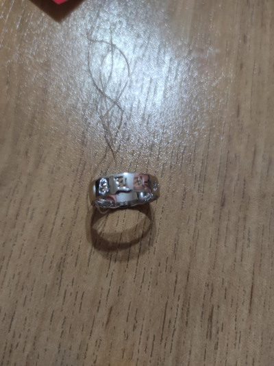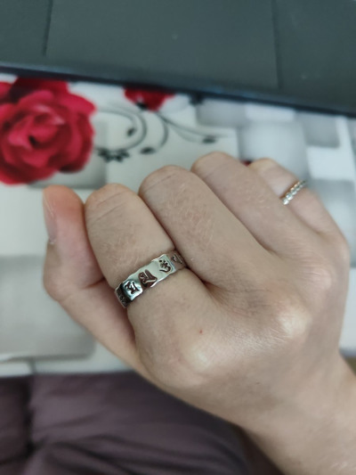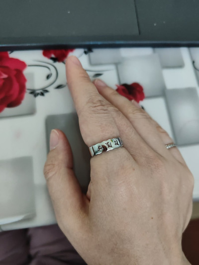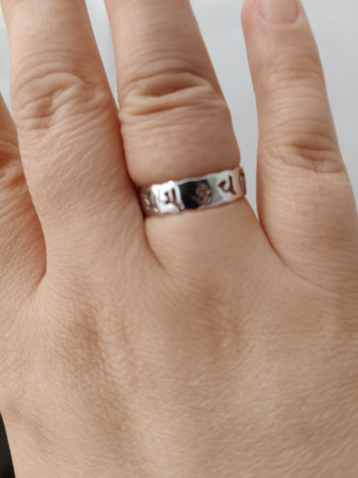 Очень нравится колечко, с мантрой. Размер 18 на указательный палец идеально сел. Мантры не выгравированы, а прям дырочками.