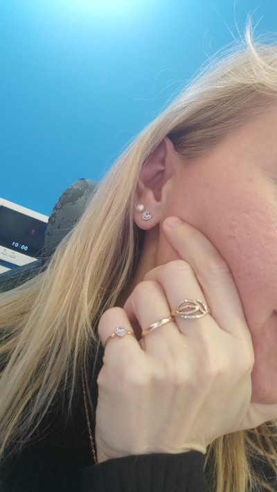 У меня и колечко и сережки на ушках из комплекта. Очень довольна! Очень миловидно! Нежно. Изысканно!