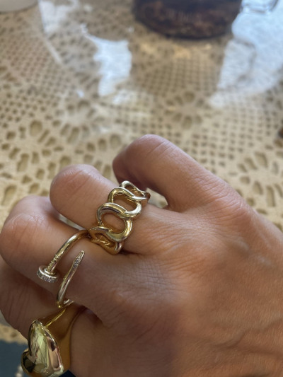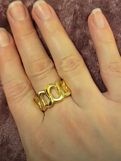 Красивое, фактурное кольцо из желтого золота. Интересная форма в виде звеньев цепи. Производство Италия.