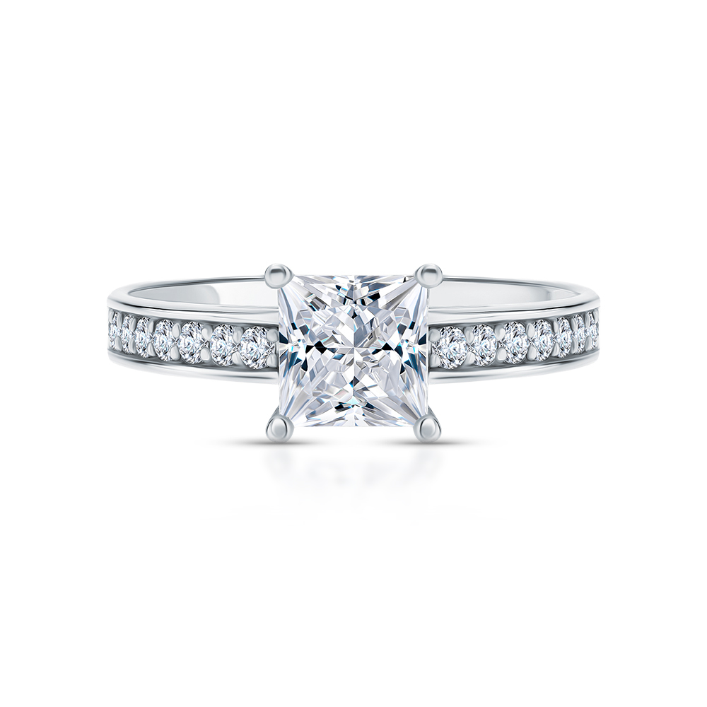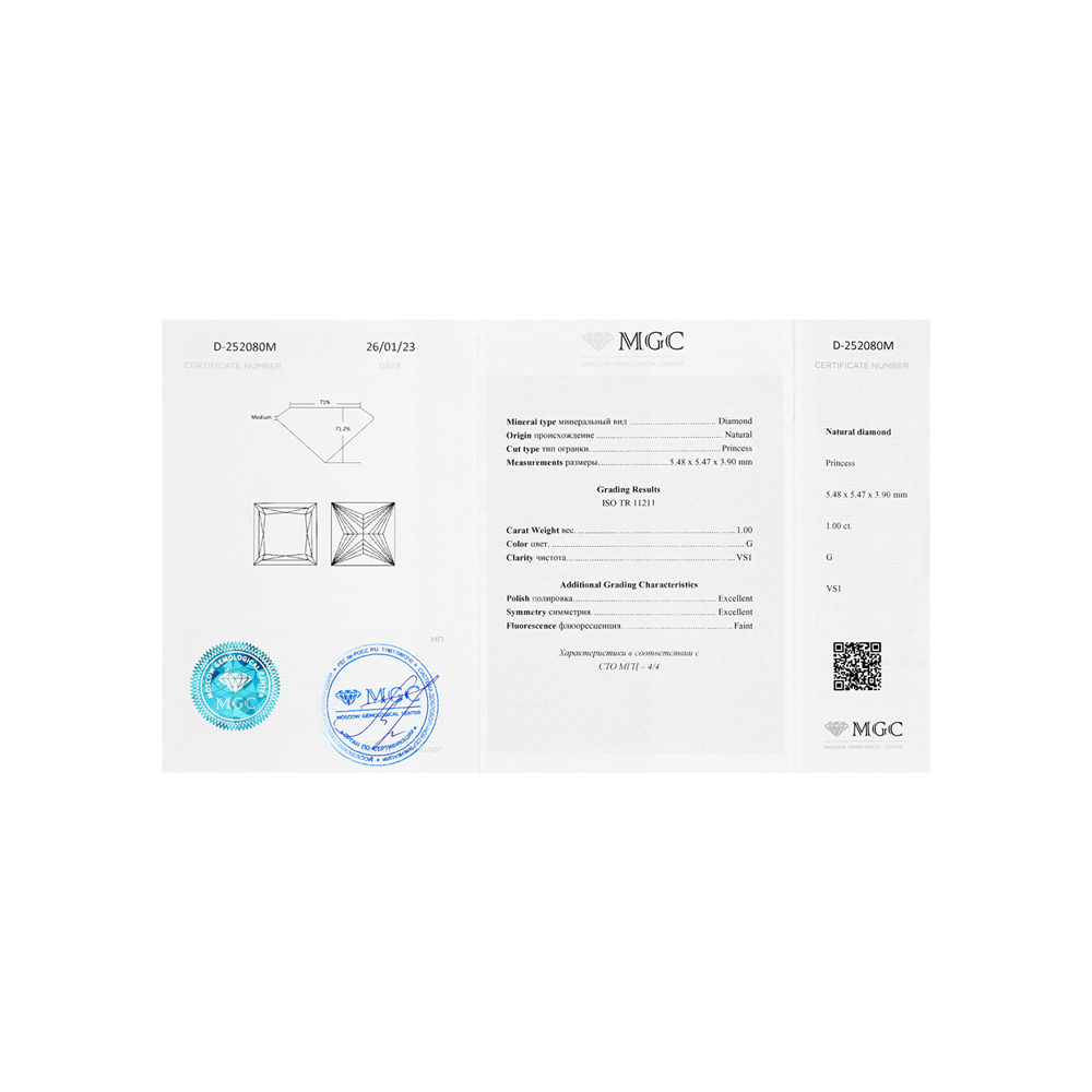 Кольцо с 1 бриллиантом природным, 1.01 карат, огранка принцесса 65 граней, цвет 4, чистота 6, тип огранки А;