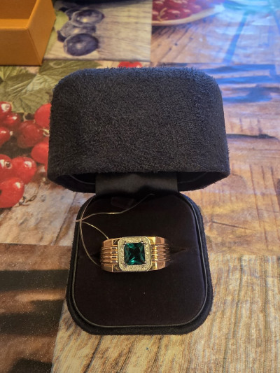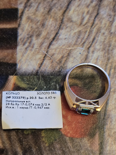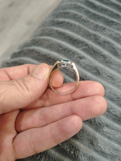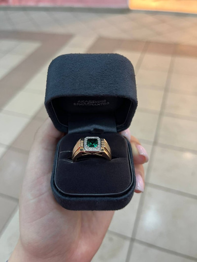 Смотрится шикарно на пальце. Зелёный изумруд вокруг россыпь бриллиантов пусть не большие но когда их много на солнце переливаются. Мне очень понравилось.