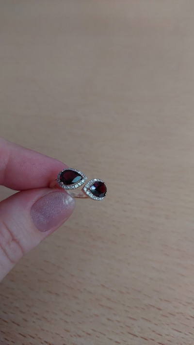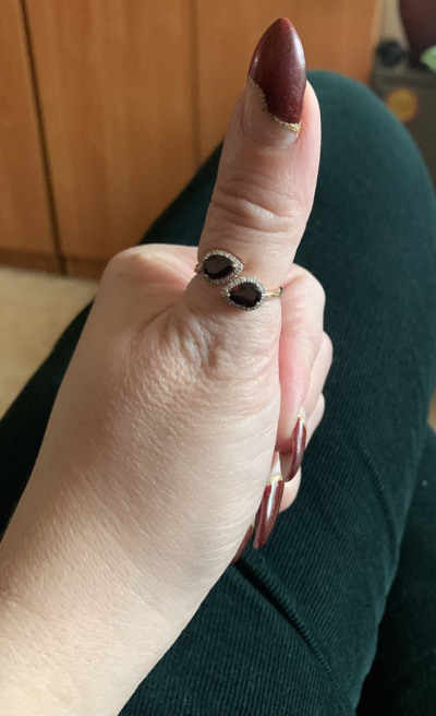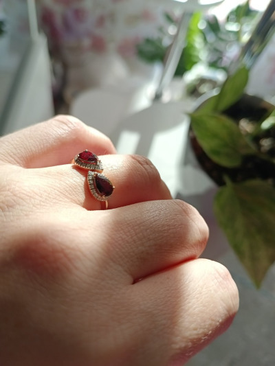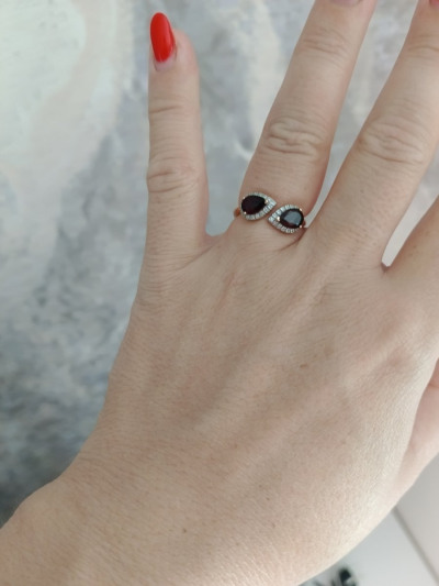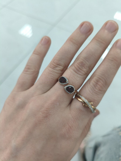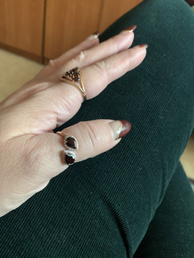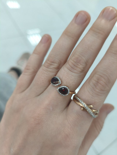 Прекрасное украшение. Наконец нашла модель, которая удобна для большего пальца. Бриллиантики ярко обрамляют лепестки из граната. Покупкой очень довольна.