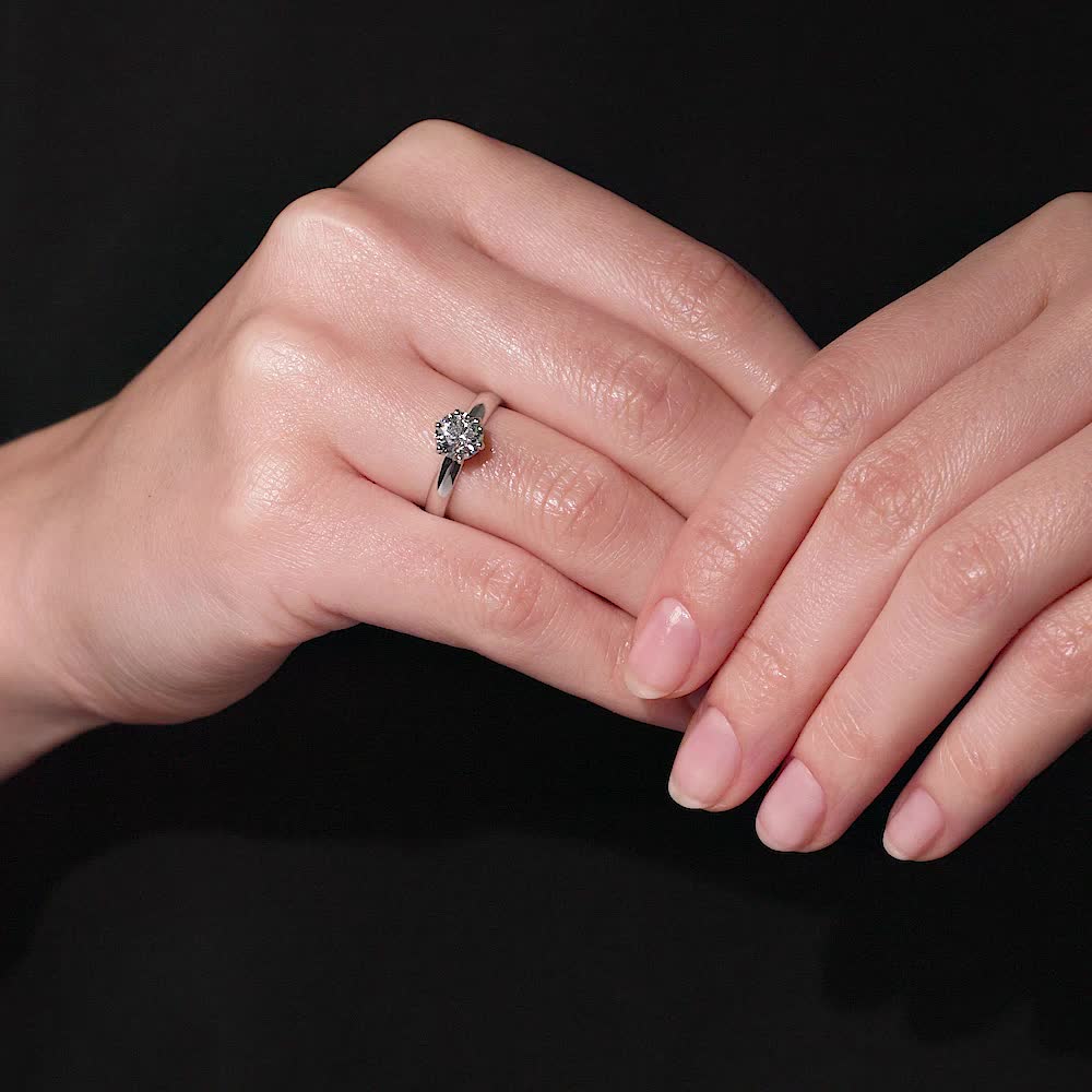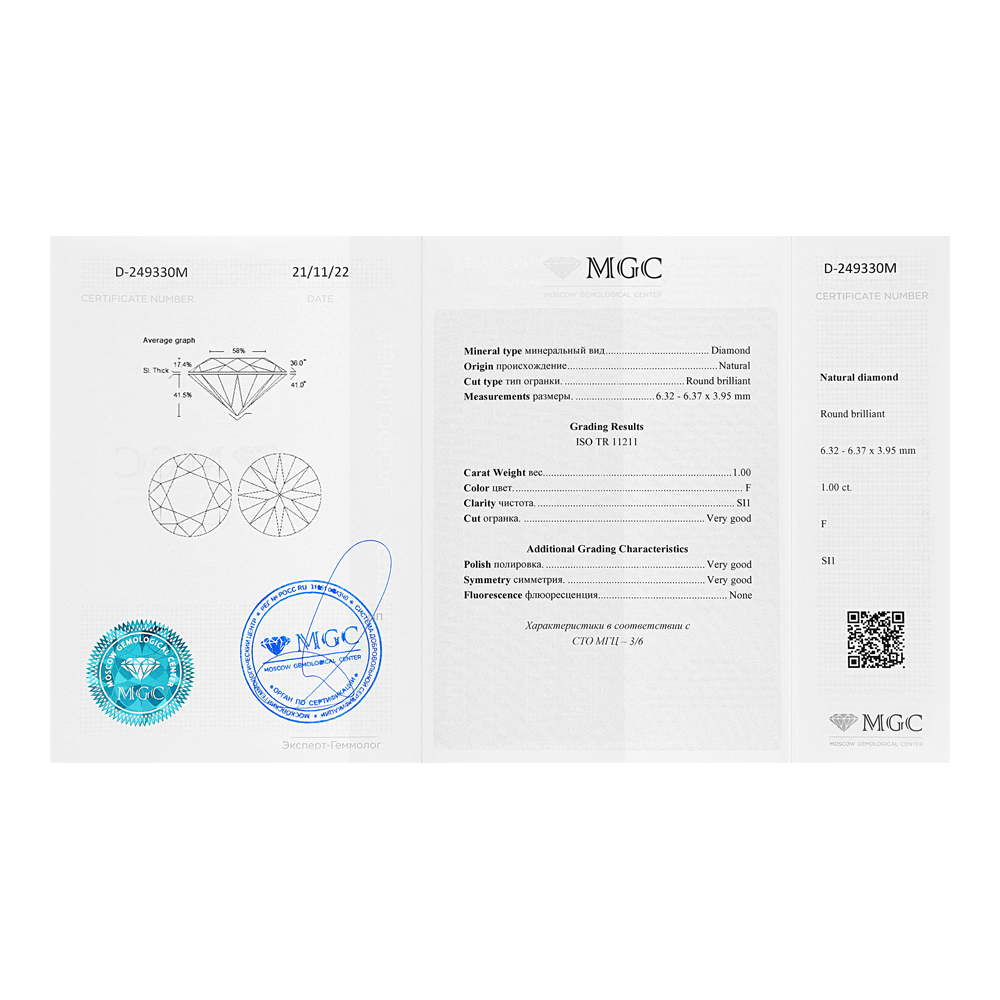 Кольцо с 1 бриллиантом природным, 1 карат, огранка круг 57 граней, цвет 3, чистота 6, тип огранки А;