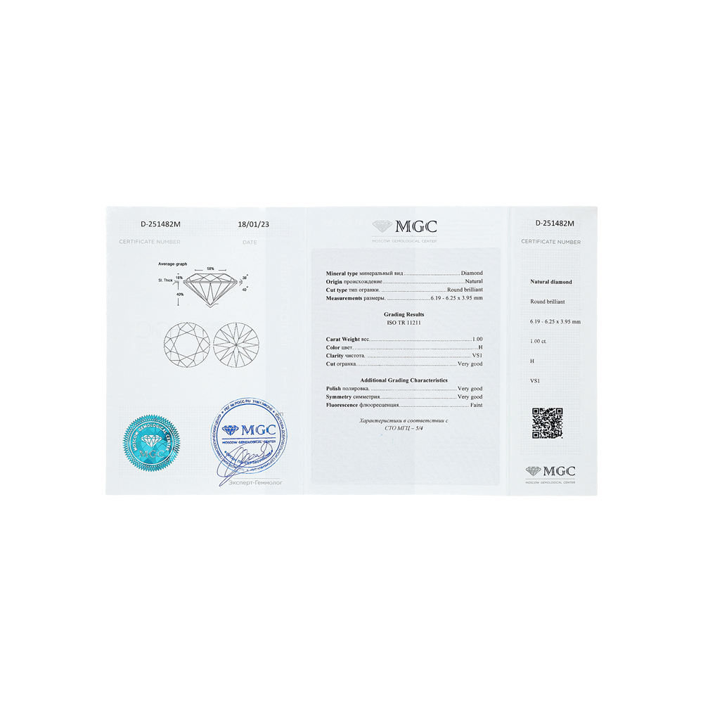 Кольцо с 1 бриллиантом природным, 1 карат, огранка круг 57 граней, цвет 5, чистота 4, тип огранки А;