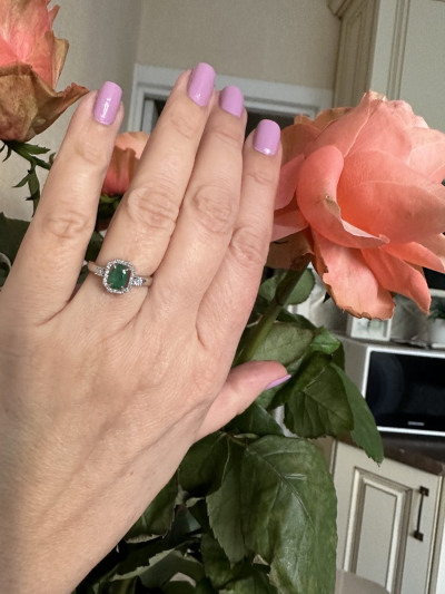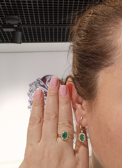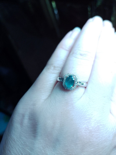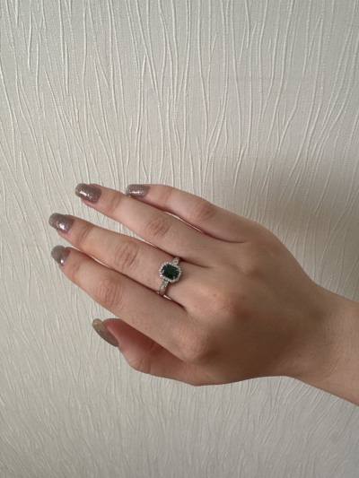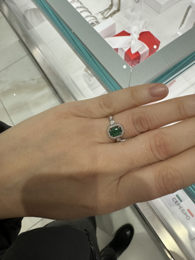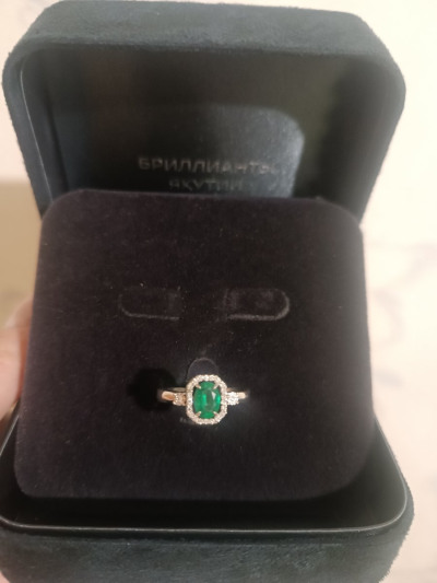 Лаконичное кольцо , для повседневной носки. Как уже в отзывах писали - не вычурное ) Изумруд большой в окружении бриллиантовой крошки , что и делает акцент на камень . Цвет камня совпадает с цветом камней в пусетах , что большая редкость ! Я очень довольна 👌