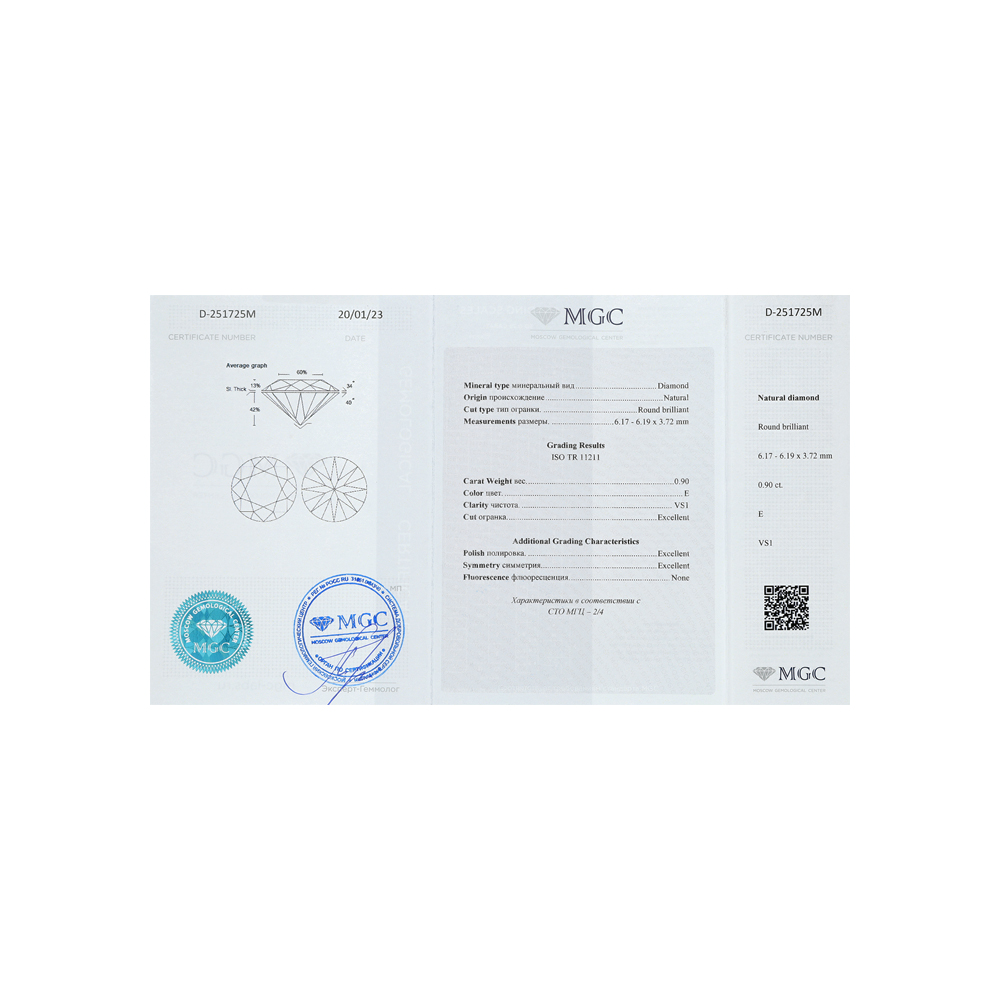 Кольцо с 1 бриллиантом природным, 0.9 карат, огранка круг 57 граней, цвет 2, чистота 4, тип огранки А;