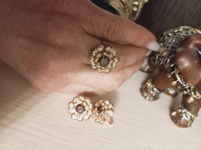 Первые впечатления не очень. Очень хотела бижу с коньячными камешками. Отличается от фото сильно. На фото кажется что на лепестках тоже камни коньячные местами, в реальности, все камни белые, кроме центрального. Но при определенном свете и на фото реально кажется, что камни по краям коньячного цвета. По факту, цвет позолоты выглядит очень дешево, как цыганское золото. Цветок сам не большой. К качеству претензий нет, сделано хорошо. В целом, я оставила, цена не большая, как бижутерия сойдет. Носить рекомендую вечером, тогда смотрится не так дешево) а даже очень прилично.