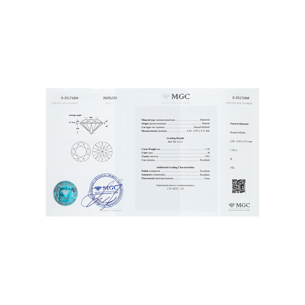 Кольцо с 1 бриллиантом природным, 1.3 карат, огранка круг 57 граней, цвет 5, чистота 5, тип огранки А;