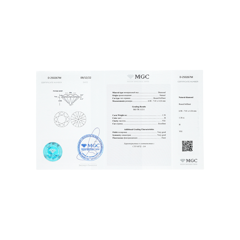 • Кольцо с 1 бриллиантом природным, 1.25 карат, огранка круг 57 граней, цвет 5, чистота 4, тип огранки А;