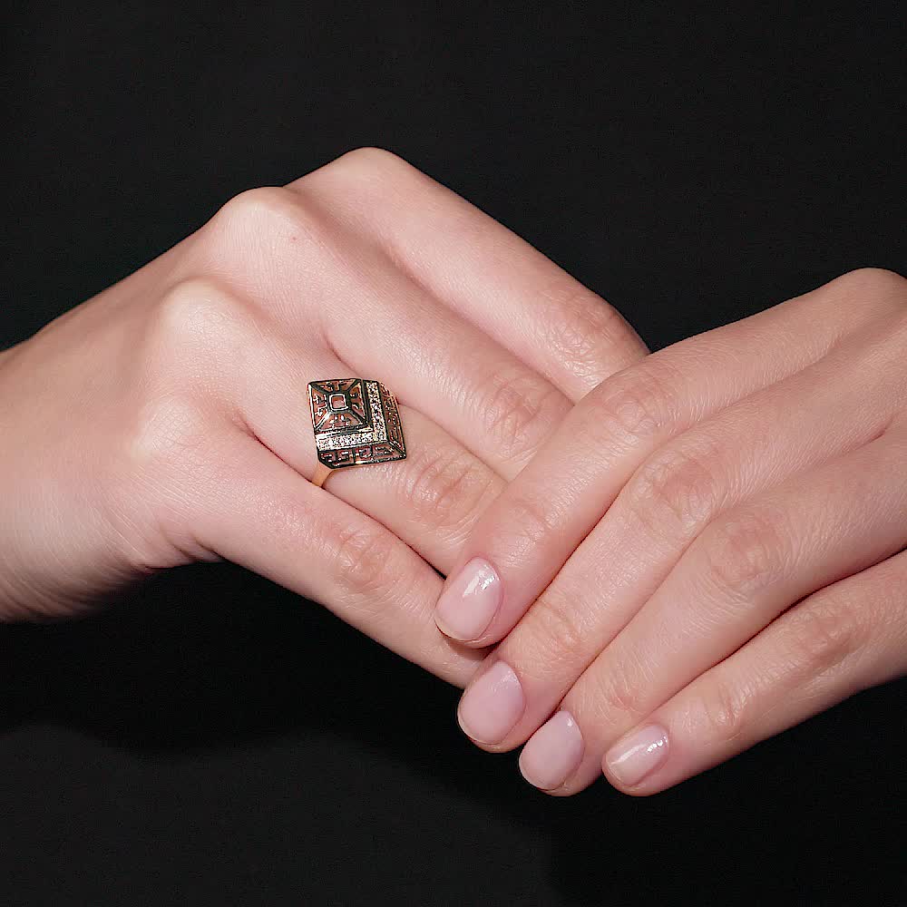 Долго думала выкупать или нет, немного разочарована. Очень интересная дизайнерская задумка на тему Древней Греции, как увидела его в каталоге, сразу положила в Избранное. Но... кольцо на палец не ложится, не удобно! Оно плоское и ему не хватает подъёма. Долго крутила его - какой стороной удобнее повернуть к себе. Планировала на правую руку, но кольцо просится на левую, туда, где оно на пол размера больше.