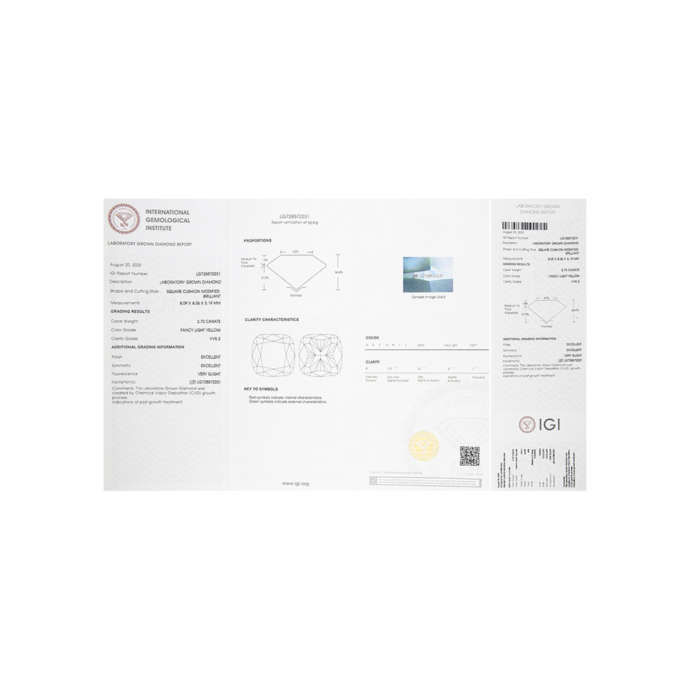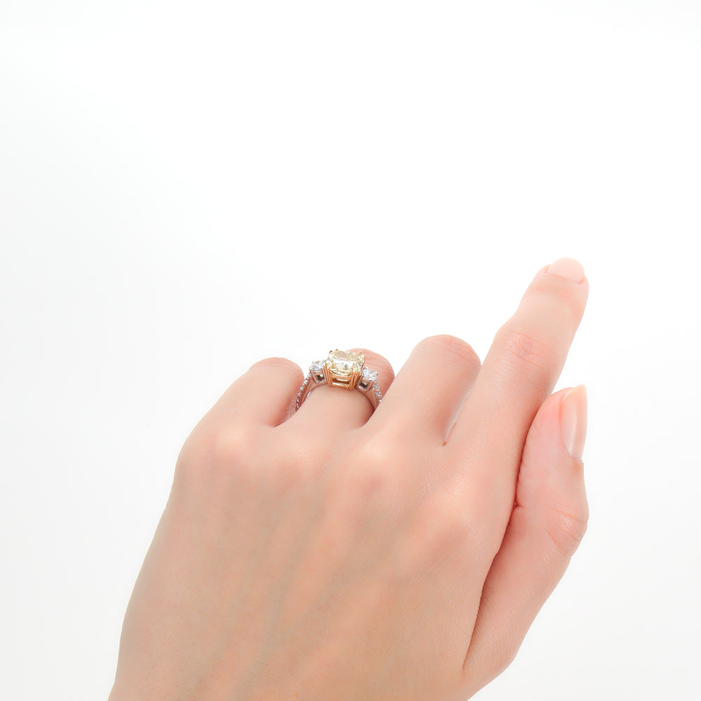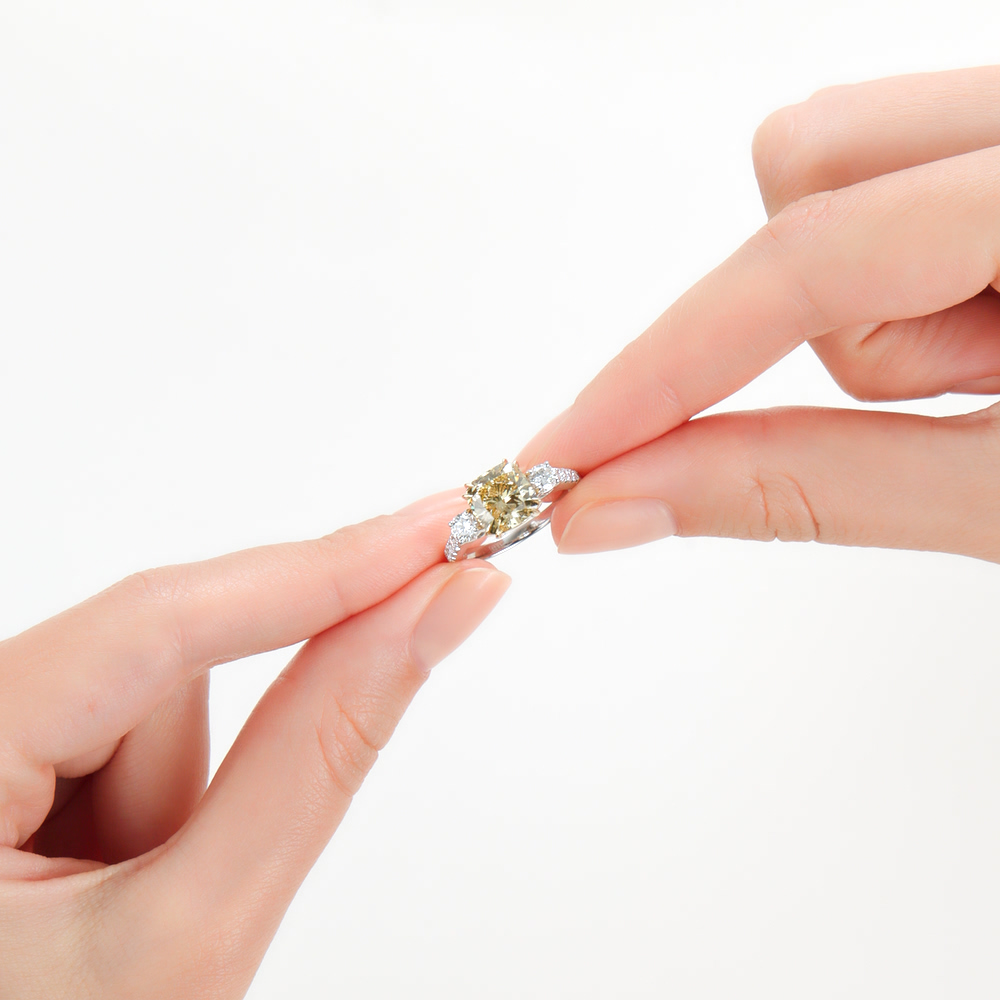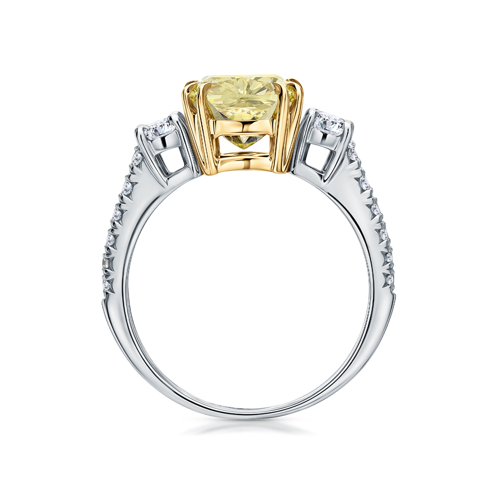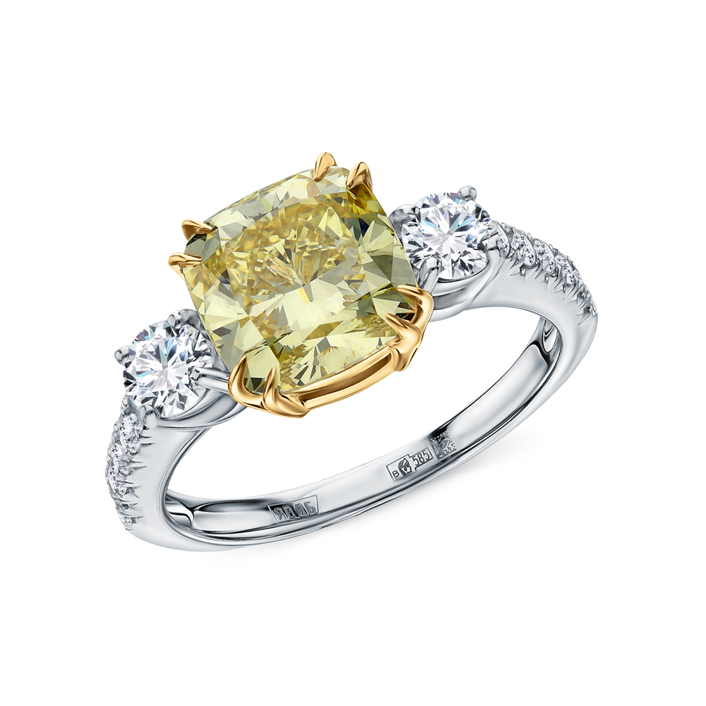 Кольцо с 1 бриллиантом выращенным, 2.71 карат, огранка кушон 57 граней, цвет Желтый, чистота 5, тип огранки А;