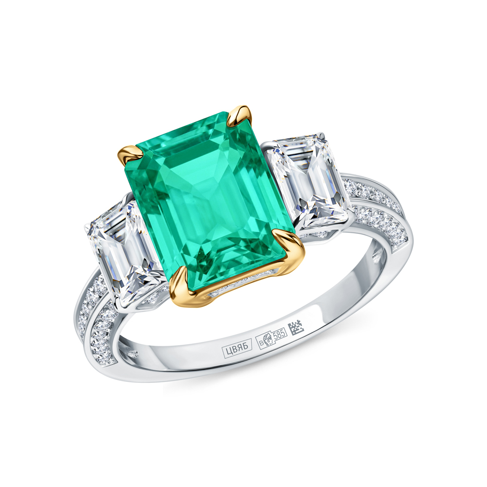 Золотое кольцо с бриллиантами выращенными и изумрудами выращенными