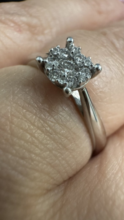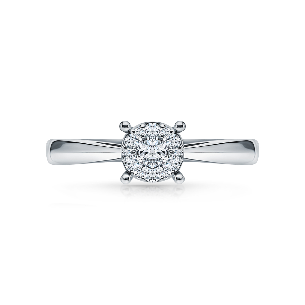 Кольцо из белого золота 585 пробы, украшенное 12 бриллиантами общим весом 0.087 карата и главным бриллиантов — 0,04 карата. Характеристики камней: