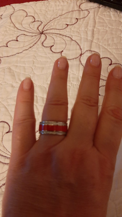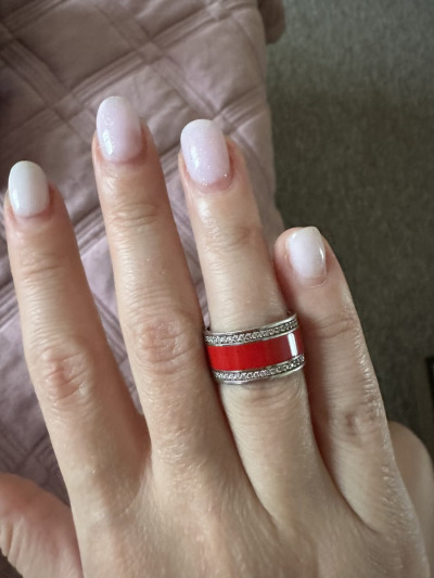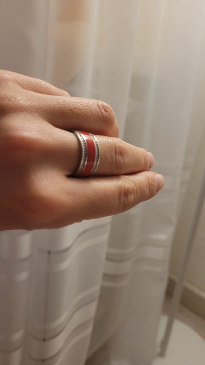 Сдержанный, но заметный дизайн: красная эмаль, по краям дорожки из фианитов. Кольцо большое, но не тяжелое