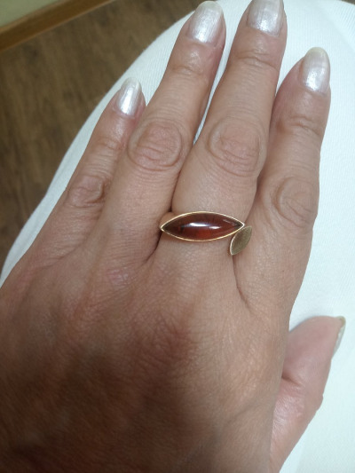 Интересной формы перстень, на пальце выделяется крупной формы янтарь