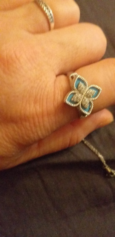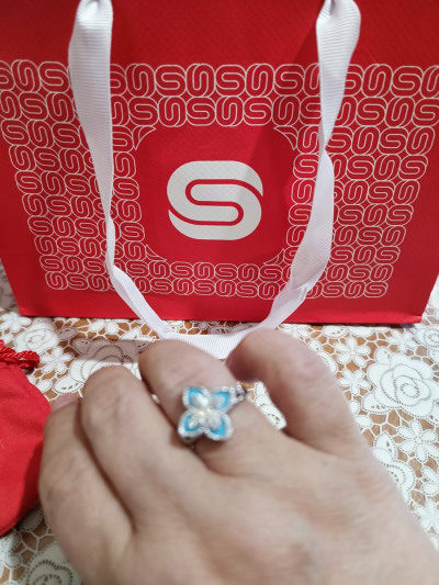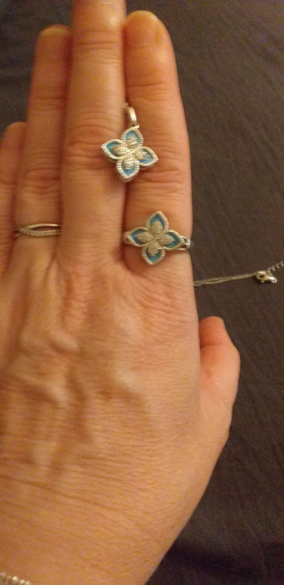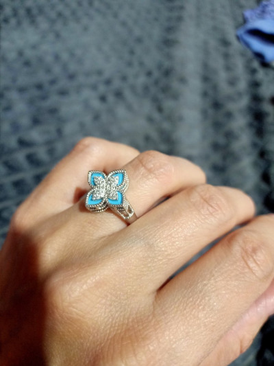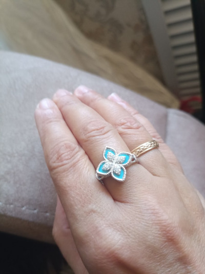 Нежное колечко формы цветка клевера. Подойдет только для маленьких ручек. Приятный бирюзовый цвет, очень красивый.