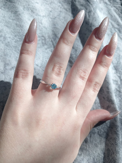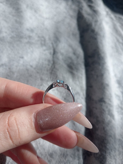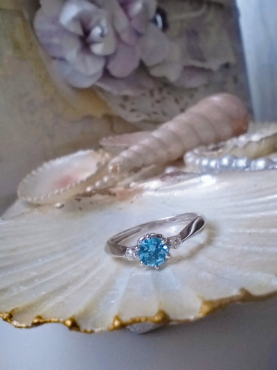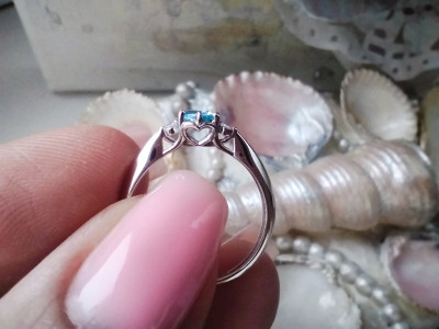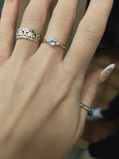 Не тонкое, плотное кольцо. Камень топаз свисс хорошо выделенного голубого цвета . Не очень бывает удобно из-за того, что выпирает место крепления камня ,но в целом приятное, красивое кольцо