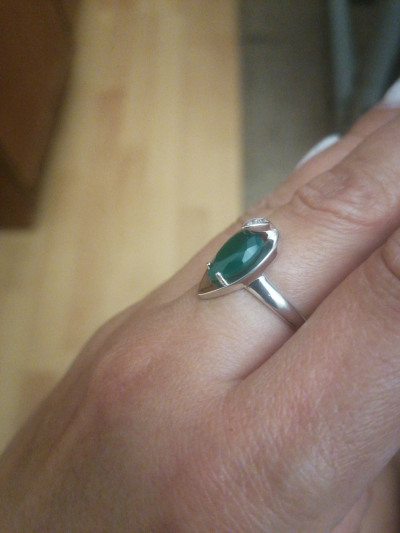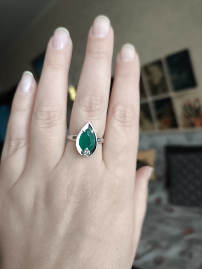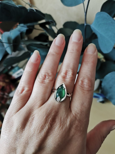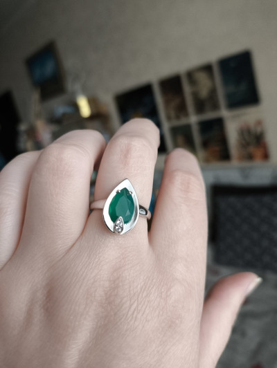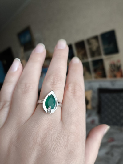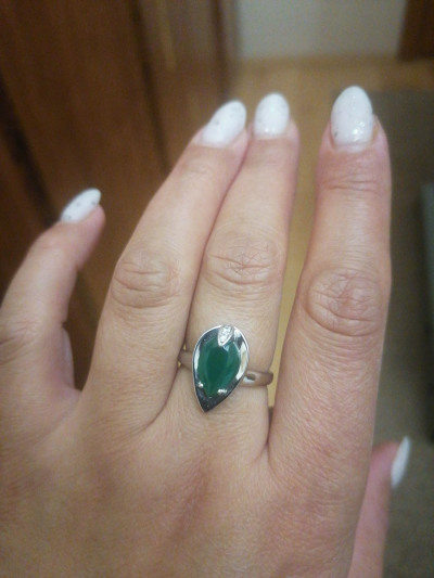 Приехала за заказным колечком, но когда увидела это в магазине, то выбор сразу пал на него. Кольцо не крупное. Красивый зеленый агат. Нежное, милое колечко. Смотритца очень красиво и дорого.