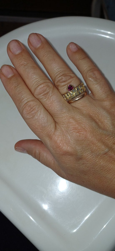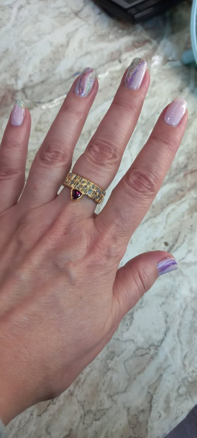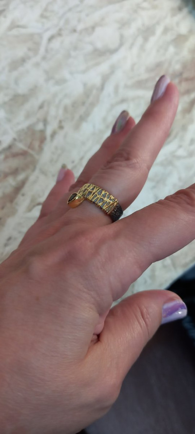 Как уже писала в оценке варианта такого кольца с хризолитом, привлек внимание необычный дизайн и исполнение: серебряная часть имитирует 'мятый' металл, в этом варианте серого цвета, а имитация переплетенных 'нитей' покрыта, на мой взгляд, скорее жёлтым, чем красным, напылением. (Мне кажется, что кольцо было бы выигрышней, если бы по цветовой гамме было именно, как на фото из сайта: основа - более темной, а позолота - более красной.) Напыление 'нитей' выполнено и с внутренней стороны кольца тоже. Этот вариант идёт размер в размер. Но спокойно можно брать и на размер, пол-размера больше - за счёт фактуры и выступающего камня кольцо абсолютно не скользит по пальцу, что очень удобно, особенно для отсекающий пальцев. Так и не смогла выбрать одно из двух вариантов (ещё и с хризолитом) и купила оба 😄