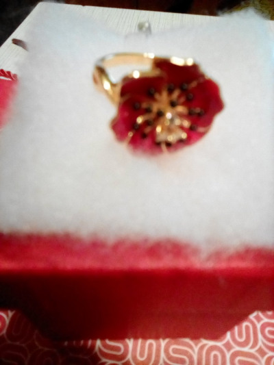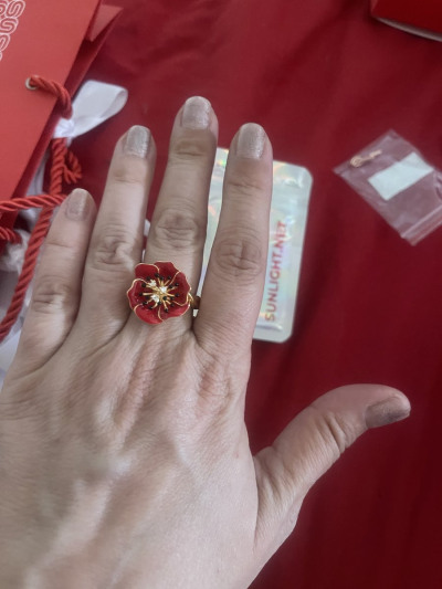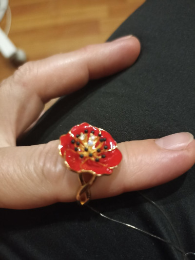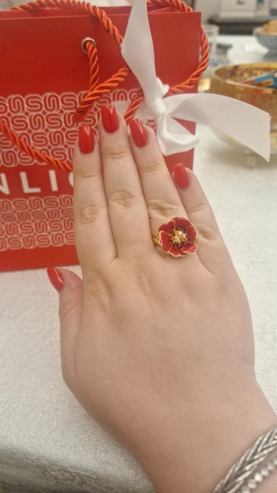 Это просто красный Мак! Рельефный цветочек на вашей руке и тычинки выполнены с фианитиками, блестят, как капельки росы на солнце. Тонкая работа полна очарования, просто прелесть!