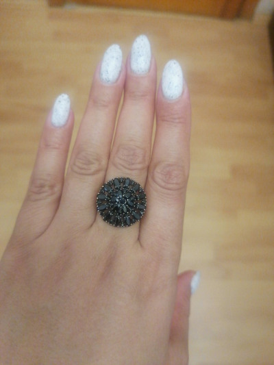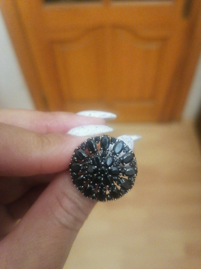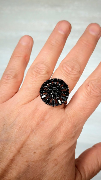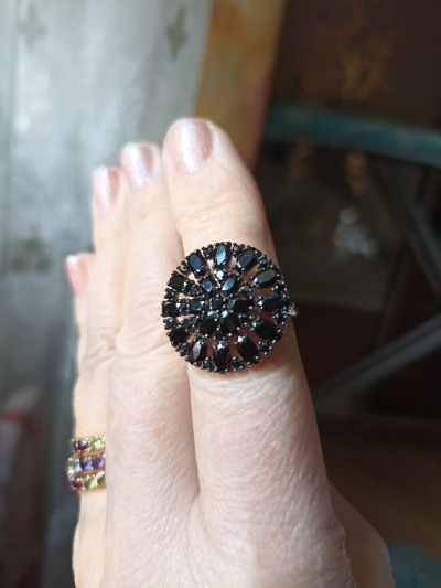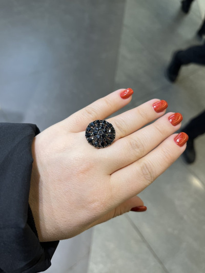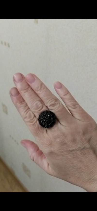 Яркое колечко с блестящими чёрными камешками. Кольцо сверкает при любом освещении.